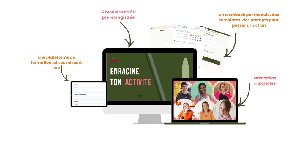 6 ateliers en format pré-enregistrépour avancer à ton rythme, quand ça t’arrange, sans bloquer des journées entières.